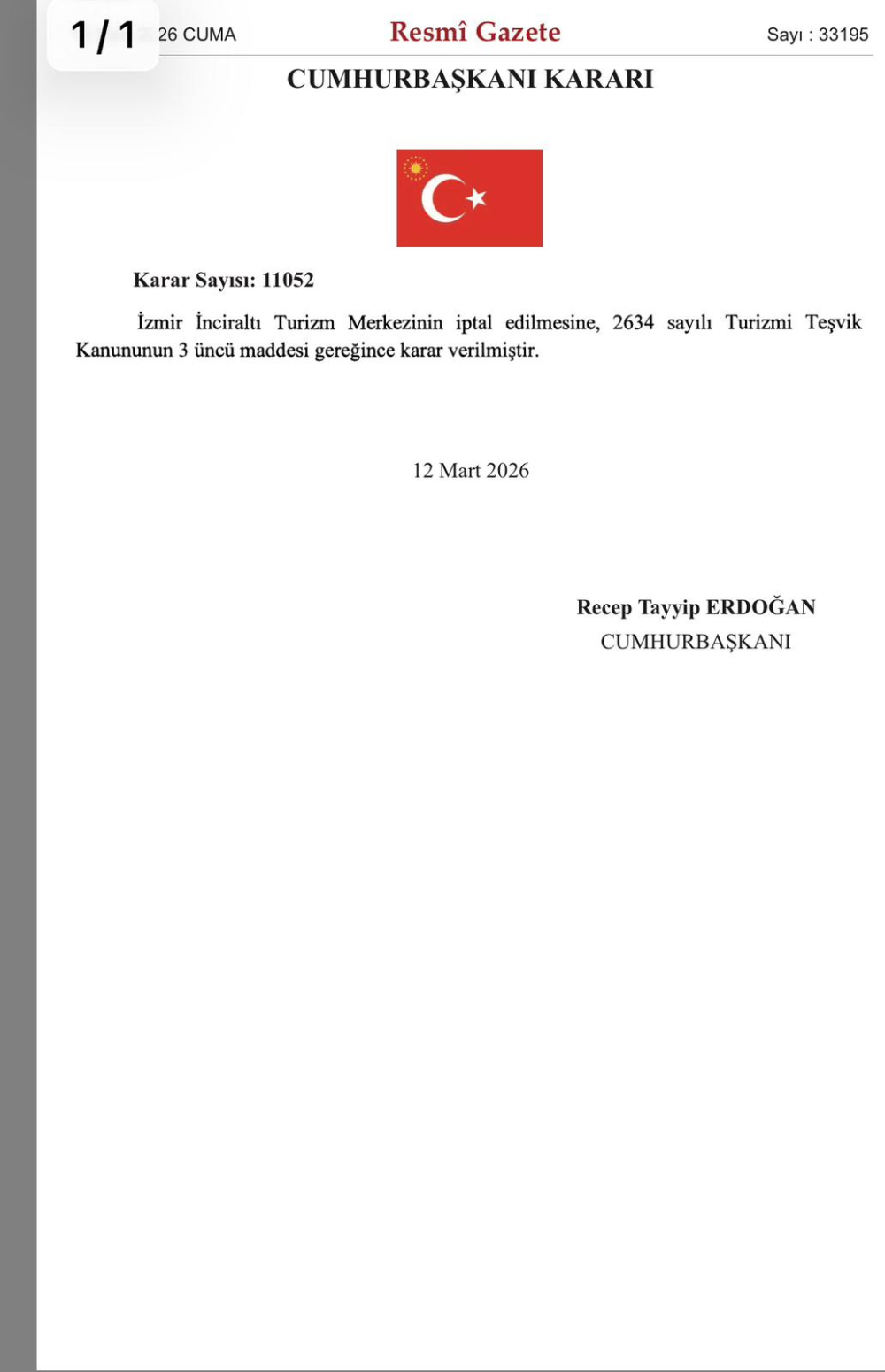 Resmî Gazete’de bugün yayımlanan Cumhurbaşkanlığı kararıyla, İnciraltı’nın turizm bölgesi statüsü kaldırılmış ve bölgenin tercihli ve karma planlama esaslarıyla yeniden planlanmasının önü açılmıştır.